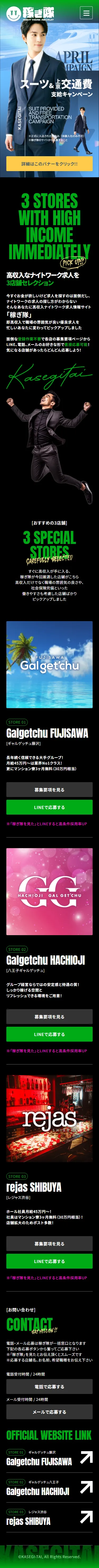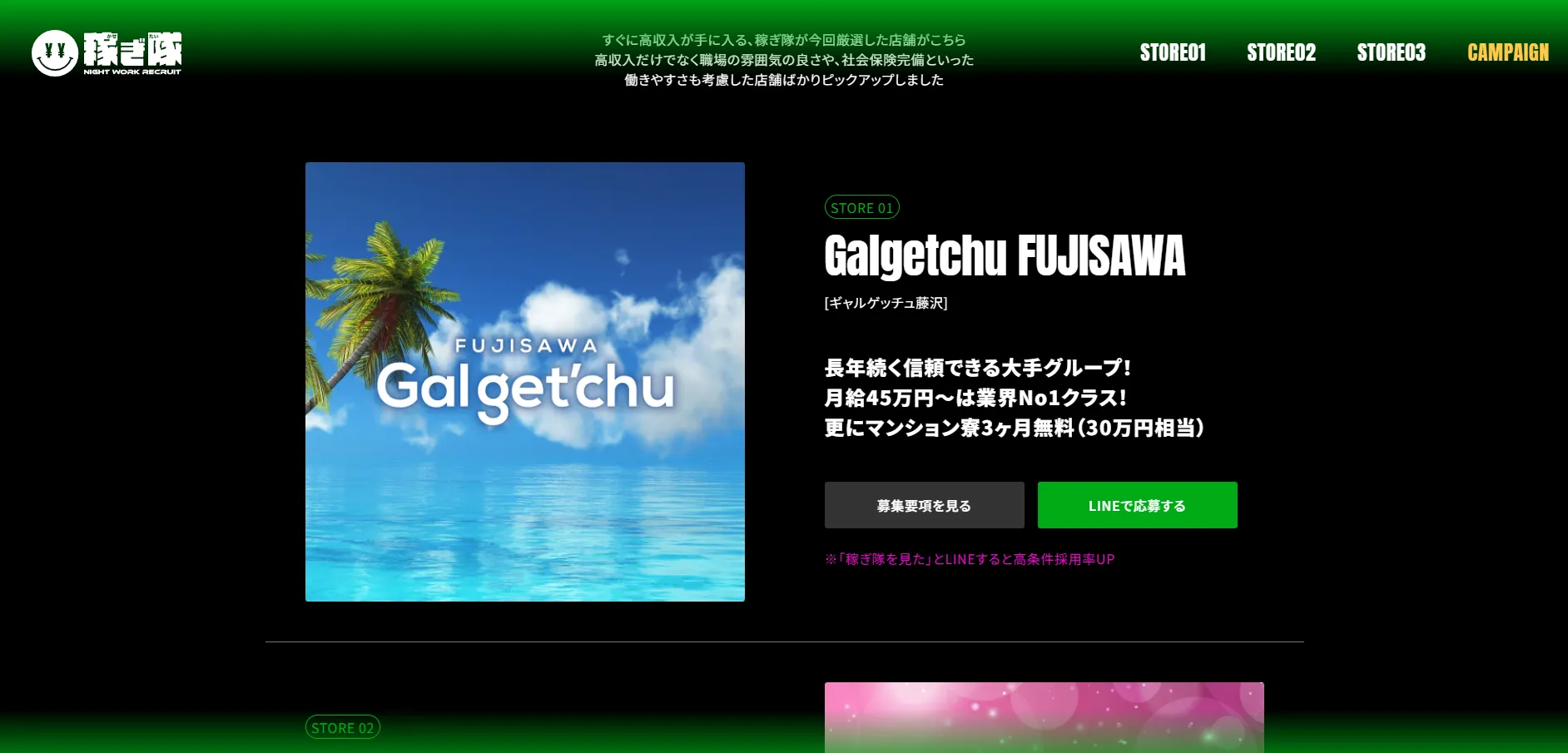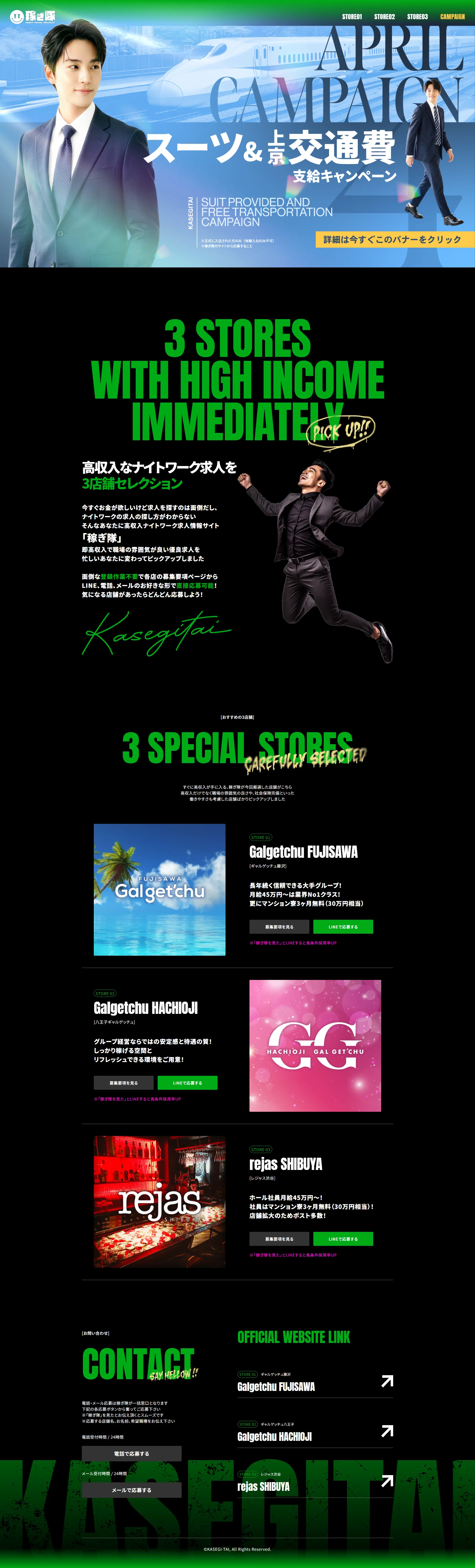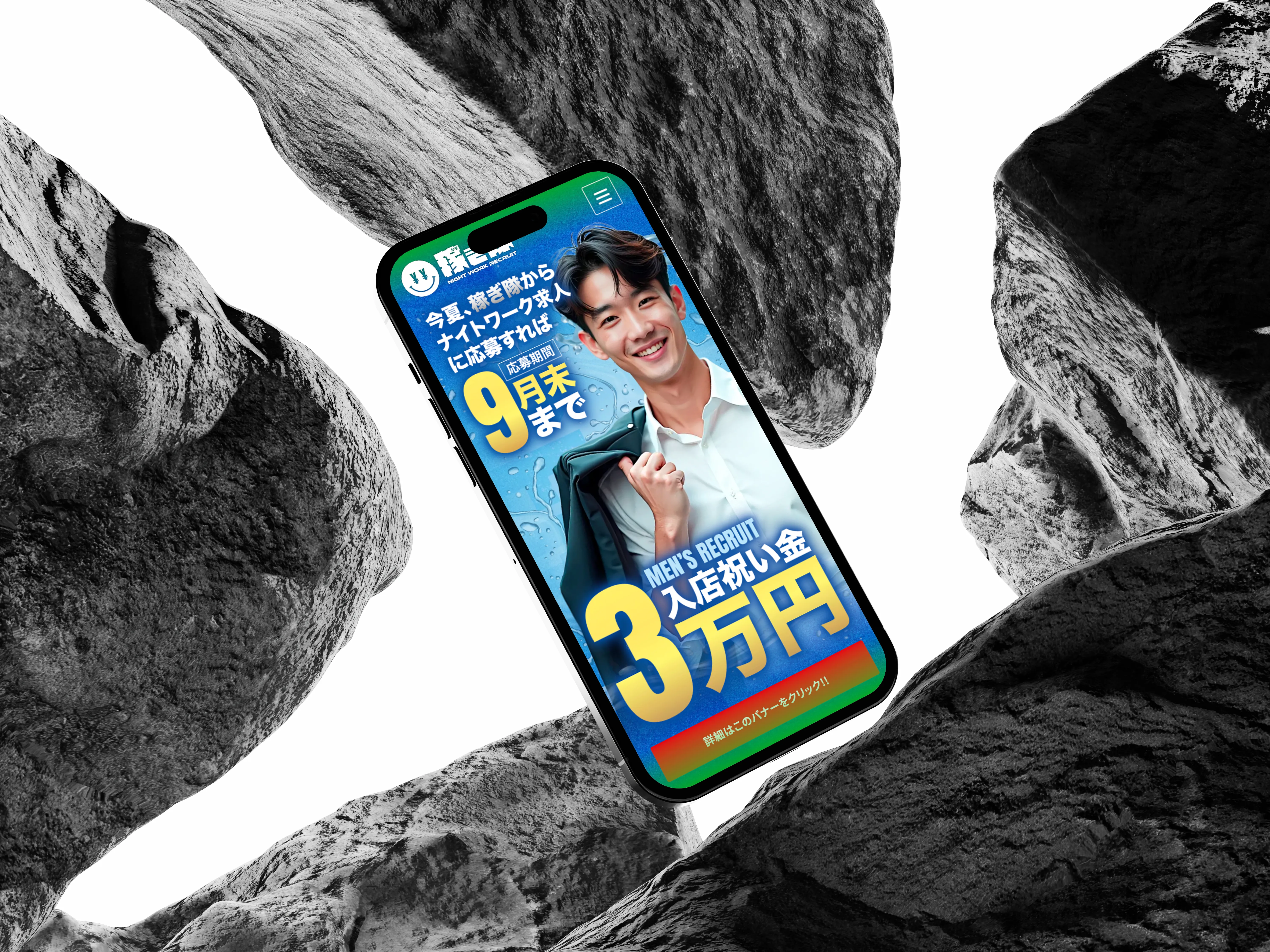 男性スタッフの求人応募改善のために求人繁忙期に向けて社長から3週間という短い期間で制作を依頼された自社ナイトワーク求人サイト、特に地方からの上京組をターゲットにしているとのことだったので親しみやすさよりクールさのあるデザインで都会の魅力をアピール