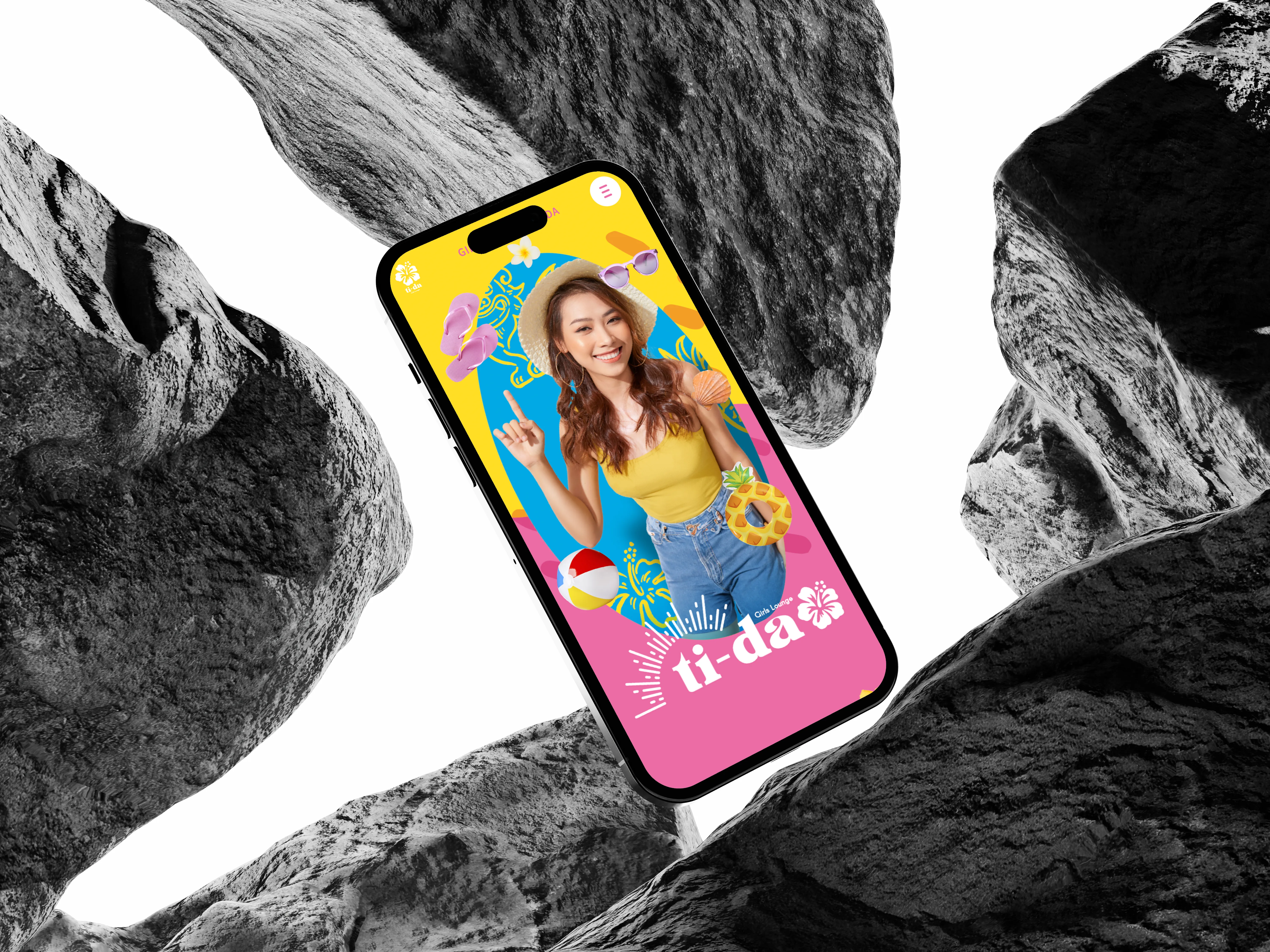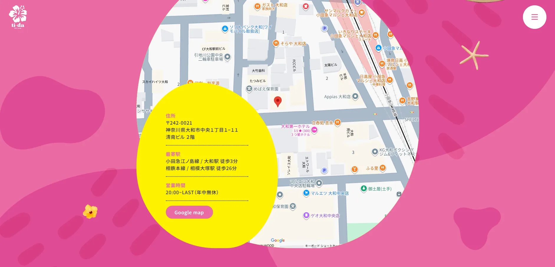 店舗のコンセプトである「沖縄コンセプトのガールズバー」を体現するため、ビビットな色使いで沖縄の厳しい日差しやシーサーやハイビスカスといった沖縄のアイテムを多数散らしたりフレームを流体シェイプにすることでチルい雰囲気を出したデザイン