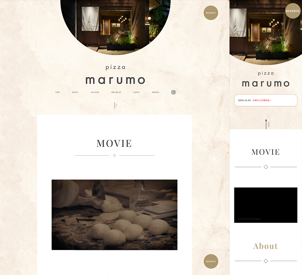 当初は写真の用意もなくインスタへ誘導のみのサイトとの事でブランディング重視で構成していたのですが、公開後写真を見せたいとの事でギャラリーやムービー欄を追加。